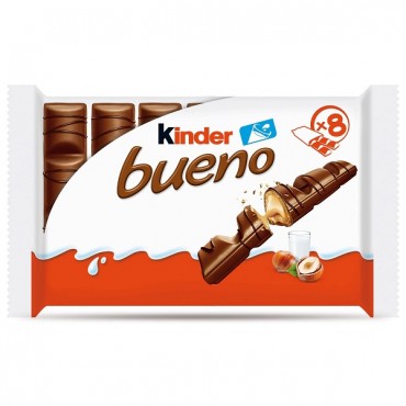 Kinder Choco Bueno T2 43gKinderSnack de Chocolate Kinder Bueno embalagem 43 gO prazer de Kinder BuenoKINDER BUENO são duas barrinhas de wafer crocantes com recheio cremoso de leite e avelãs, cobertas ..