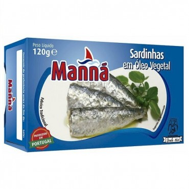 Manna Sardinhas Oleo Vegetal Lata 120g 1Un.Sardinhas em Óleo Vegetal Manná 120gUPC: 5601721110013Marca: MannáIngredientes: Sardinhas (Sardina pilchardus) (75%), Óleo Vegetal (Girassol), Sal.ALERGÉNIOS..