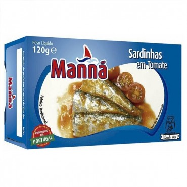 Manna Sardinha Tomate Lata 120g 1Un.Sardinhas em Tomate Manná 120gUPC: 5601721110112Marca: MannáIngredientes: Sardinhas (Sardina pilchardus)(75%), Água, Concentrado de Tomate (10%), Óleo Vegetal (Gira..