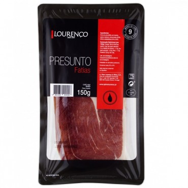 LOURENÇO Presunto Fatias 150gLOURENÇOPresunto Fatiado 9 Meses cura embalagem 150 gClássico - Fatiado 150gDescriçãoFatiado Tapas 150g - 9 Meses de curaLista de IngredientesPerna de suíno (96%), sal mar..