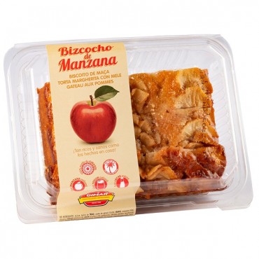 Bolo de Maça Gimar 400gBolo de Maça Gilmar 400 g Bizcocho de Manzana 400 gINGREDIENTES: Azúcar, harina de TRIGO, aceite de girasol (15%), HUEVO, glicerina, manzana (8,1%), GGUR natural (2,7%), LECHE e..