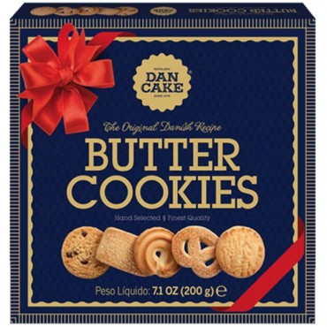 DanCake Butter Cookies Caixa 200g 1Un.DanCake bolacha dancake butter cookies embalagem 200 gCaracterísticasQuantidade Liquida: 0.2 KGIngredientes/Composição: "Farinha de trigo, açúcar, gordura vegetal..