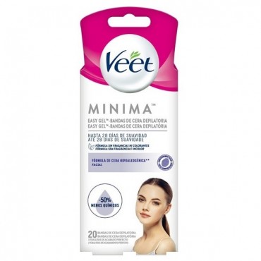 Veet Tiras Cera Depilação Facial Pure Pele Sensível (20u)1Un.Veet MinimaBandas de Cera Depilatória Facial embalagem 20 unidadesVeet - Tiras de Cera para Depilação Facial Pure - Pele Sensível (20u)INFO..